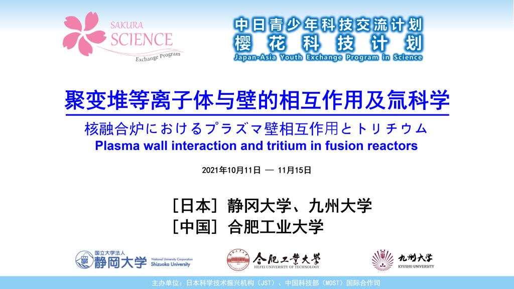 为推动我校与日本高校之间的科技交流与合作,在中国科学技术部(MOST)国际合作司和日本科技振兴机构(JST)的支持下,我校与日本静冈大学、九州大学在2021年10月11日至11月15日联合举办了2021年度“中日青少年科技交流计划(樱花科技计划)”线上交流活动。本次活动以“聚变堆等离子体与壁的相互作用及氚科学”为主题,围绕未来聚变装置中的材料与等离子体物理等关键科学技术问题,通过专题报告、研讨会、虚拟参观等形式开展了一系列线上交流。此次活动分为六个场次,中日相关学科教授、研究人员和科研团队等170余人次参加。