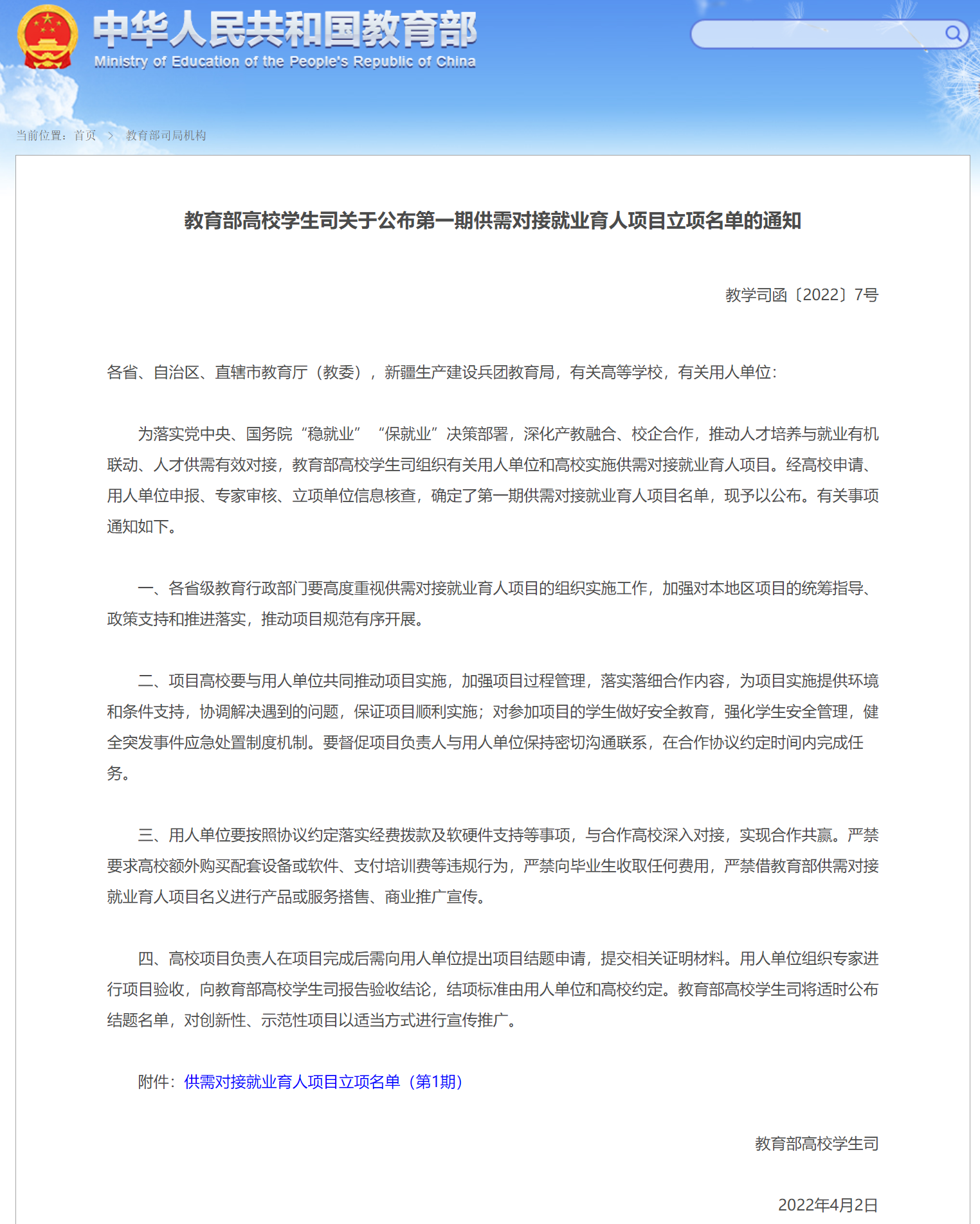 据悉,为落实党中央、国务院“稳就业”“保就业”决策部署,推动人才培养与就业有机联动、人才供需有效对接,促进高校毕业生更加充分更高质量就业,教育部首次实施供需对接就业育人项目。供需对接就业育人项目实施项目制管理,就业实习基地项目由用人单位会同高校共建就业实习基地,提供场地、设备、指导教师等,协助安排食宿,发放实习补贴,用人单位在实习过程中储备人才资源、遴选考察毕业生,帮助更多毕业生通过实习实现就业。