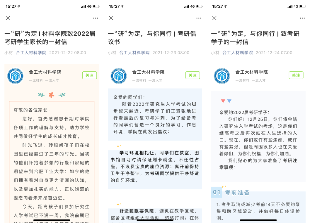 家校联动,共同护航。考研前夕,通过发布三封信“致考研学生家长的一封信”“考研倡议书”“致考研学子的一封信”,联动家庭力量、同学力量、个体力量,呵护学子备考心态、畅通学子学习场地,提醒学子考前准备、改善学子休息环境,共同为学子们考研路上保驾护航。
