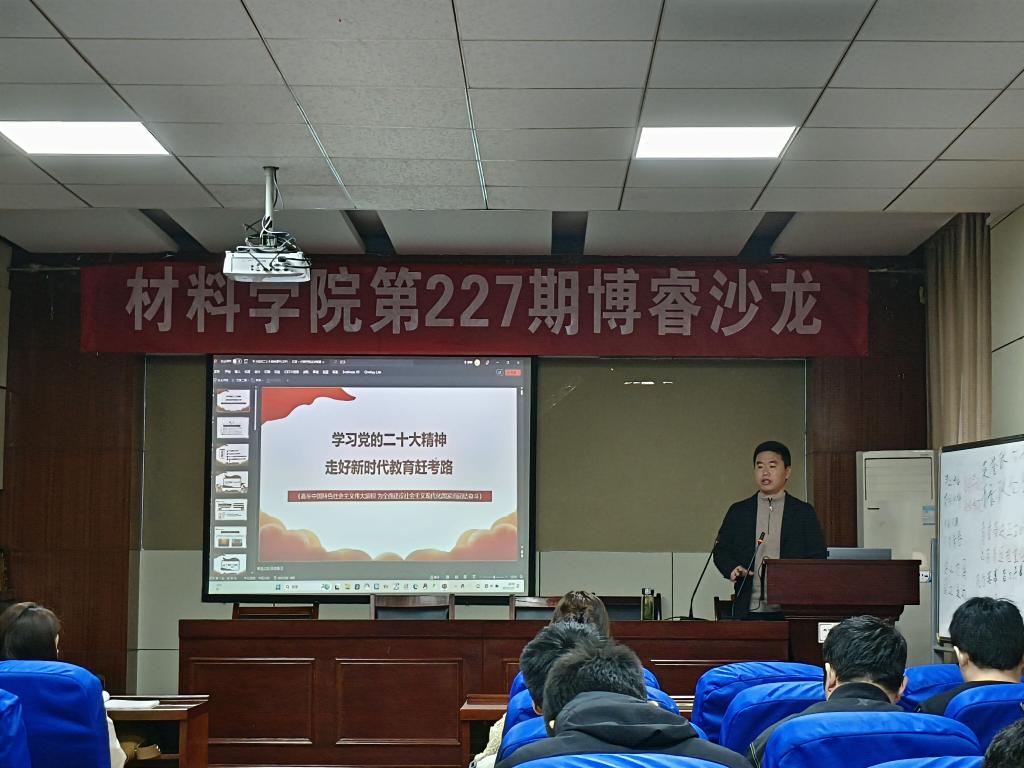 随后,项宏发细致讲解了党的二十大报告中习近平总书记关于教育的重要论述。他表示,作为高校教育工作者,要深刻理解教育在国家发展战略中的重要作用,紧密围绕“科教兴国”战略,认真履职尽责,不负神圣使命;在“强化现代化建设人才支撑”上,要立足全面推进素质教育,全面提高创新能力培养,为国家输送大批优秀人才;要面向经济主战场,贯彻新发展理念,着力推动高质量发展,坚持“科技自立自强”,勇于变革、积极创新,主动适应知识生产方式变革,主动服务“国之大者”,产出更多原始创新成果。