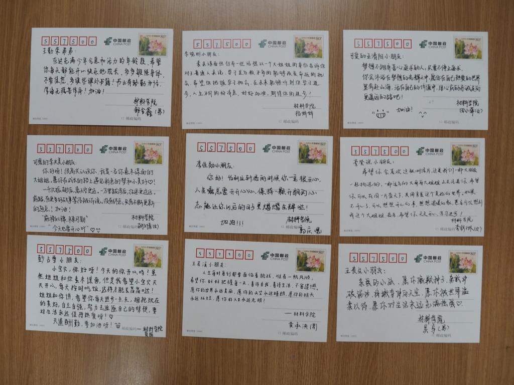 4月13日,学院研究生会成员和材物化研究生党支部的党员们齐聚材料学院小红楼103,为长青第二小学五年级(2)班的27名小学生精心挑选合肥工业大学主题的明信片,并认真书写了对孩子们想说的话,为孩子们送去美好的祝福。有的同学们讲述了最近学习生活中的趣事,有的同学描绘了工大校园的美丽景色,有的同学分享了大学生活的美好……在明信片的最后,大家不约而同地写下了对丹寨孩子们的鼓励与祝福,希望他们能够健康快乐地成长。此外,学院还为山区小朋友们准备了学习工具大礼包,在精神上给予鼓励的同时,也为小朋友们送上最需要的物资,帮助他们更好的求学与成长!