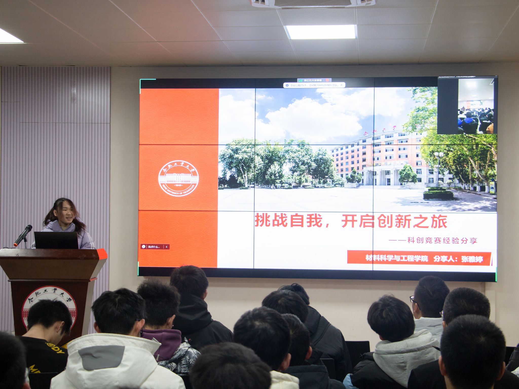 活动中,结合安徽省A/B类赛事和材料学院学科特色和优势,材料学院大学生科创中心精选大学期间部分常见赛事,围绕赛事基本信息、比赛内容、参赛途径、参赛意义和信息获取平台等方面展开详细介绍。随后,学院2020级优秀本科生张雅婷、康雯祺从自身参赛经历入手,分别就“大学生创新创业训练计划”“‘互联网+’大学生创新创业大赛”进行经验分享。按照赛事参与流程,两人依次从选题思路、项目构建、团队组建、项目撰写、答辩考察、实践凝练等环节进行讲解;通过实际案例的展示分析令现场同学对科技创新竞赛有了更为生动的认识。互动环节中,同学们踊跃提问,宣讲人员一一做出了详细的解答。活动最后,张雅婷说道,科技创新竞赛既是一场挑战,也是一场机遇,更是大学生活中一段难以忘怀、共同奋斗的精彩章节,鼓励同学们通过自己的努力,用力参与,用心体验,创造更多的可能、遇见更好的自己。