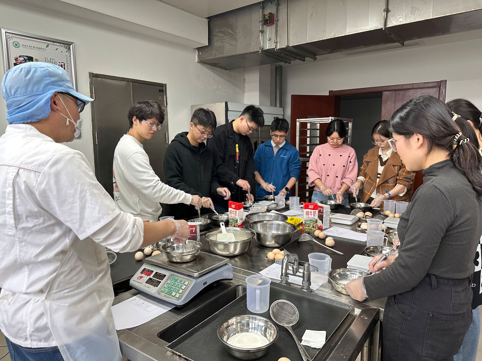 活动共分为烘焙知识讲解、甜品制作和美味体验三个环节,计划学习制备泡芙和蛋挞两类甜品。活动伊始,由饮食服务中心陈集新师傅向同学们讲解两类甜品的制备方式,从工具选用、材料准备、用量说明及操作技法等方面,向同学们一一进行教学示范。随后,同学们按照操作要求,带上手套,拿上工具,开始尝试独立制备甜品。虽然在开始时,不少同学便遇上了拦路虎,挤压出的泡芙模型不成规范,但在陈师傅的耐心指导和周围同学的互相帮助下,均渐入正轨。在一片欢声笑语中,同学们共同完成了两类甜品的制作。活动最后,伴着烘焙独有的香甜气息,同学们一边品尝,一边互相分享着成功制作的喜悦,活动现场气氛热烈,其乐融融。