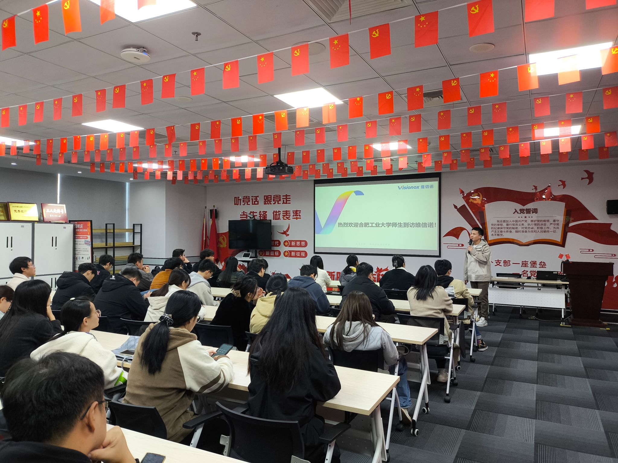 为加强同学们对高科技企业的了解,近距离感受科技创新的力量,同时进一步提升同学们的求职技能,12月2日下午,材料学院研究生会举办了“科技创新绘蓝图,工业报国正当时”主题实践活动。本次实践活动的单位是合肥维信诺科技有限公司,共有40余名同学报名参加。