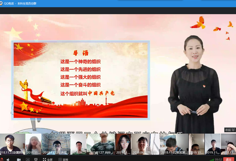 7月1日下午,为庆祝建党99周年,材料学院在本科生党员总群通过QQ群“云”平台开展了题为“在战‘疫’中读懂中国共产党”的线上视频微党课主题学习教育活动,院党委副书记、副院长杨玲老师担任主讲老师,50余名学生党员在线参加。