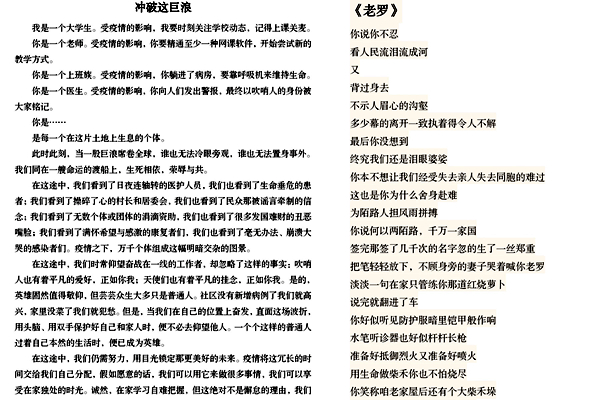 征文活动开展以来,全院学生积极投稿,以高度的热情支持本次活动——投稿的同学们或激情澎湃,写出了自己对医疗工作者的赞赏与敬佩;或以一个大学生的角度,讲述自己的所见所闻所感。一篇篇征文,承载了材料学院全体学生对战斗在疫情一线“抗疫者”们崇高的敬意,承载着同学们对必将战胜这场疫情攻坚战的信心。虽然该院的同学们大都无法奔赴“抗疫”前线,但是只要心系祖国,积极响应国家、政府以及学校号召,做好自我防护,居家安心学习,就是用实际行动贡献出了属于我们的青春力量!