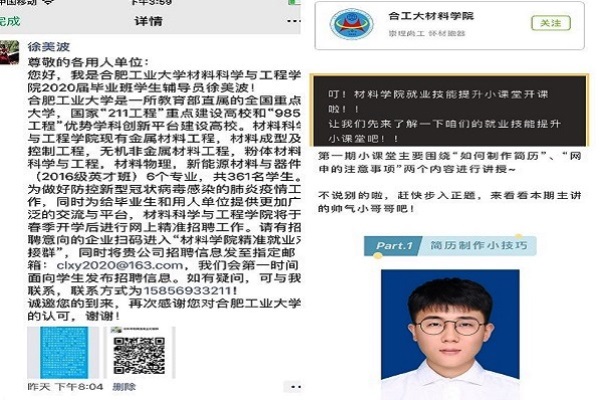 创新举措,精准服务,提升毕业生线上就业实效。面对新冠肺炎疫情,为了给毕业班学生提供更多更优质的就业机会,学院创新工作形式,加大“互联网+就业”的工作力度,建立“材料学院精准就业对接群”,截止到目前为止,已与近70家企业取得联系,为网络精准就业做好充分准备。针对就业技巧方面,在毕业班成立了“就业技能提升小战队”,录制技能提升小课堂系列视频,为待就业的同学们提供就业经验分享,提高就业技能,提前做好迎接春招的各项准备。为帮助学生提高就业信心,毕业班辅导员还一对一在线帮助学生修改简历。一系列创新举措,大大提升了线上就业的实效。