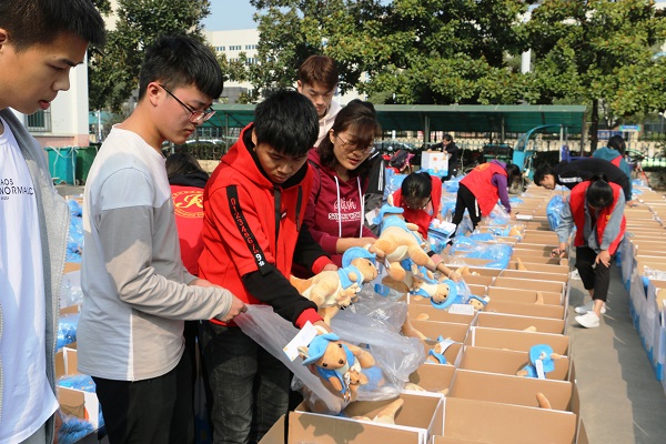 数小时后,温暖包中的物品全部放齐了,接下来是打包环节。打包是个精细又辛苦的活,在打包过程中,有的志愿者的手被划破了,但他们没有一丝抱怨,仍然耐心仔细地打包。来自材料学院的大二志愿者陶福江说:“虽然一个温暖包裹所能提供的物品有限,但我们通过参加这次活动,想到这些包裹将会给贫困地区的孩子们送去温暖,便觉得我们所做的很有意义。”