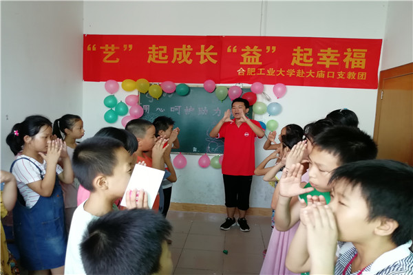 一间狭窄的教室中靠墙放着十多套桌椅,小小的黑板周围和地上放置了很多小气球,黑板上工工整整的书写了“用心呵护,助力成长”八个大字,大字的周围画满了音符和卡通玩偶,这是队员们花了一个中午的时间布置的艺术课堂教室。“留守儿童之家”的蒋老师很勉强的说到“这个教室是平时给孩子们上课、写作业用的教室,我们只会辅导他们写写作业,所以基本上没有什么设备。”实践队员们回应到“我们过来的时候都考虑到了,带了音响、话筒还有古筝,希望能够给孩子们插上艺术的翅膀。”,一旁的小朋友们用好奇的眼光紧紧地围在了教室的门口,他们争先恐后的说到“我可以进去吗?”“大家都可以参加”队员们亲切的回应到,不一会的功夫队员们将二十多位小朋友全部带进了教室。