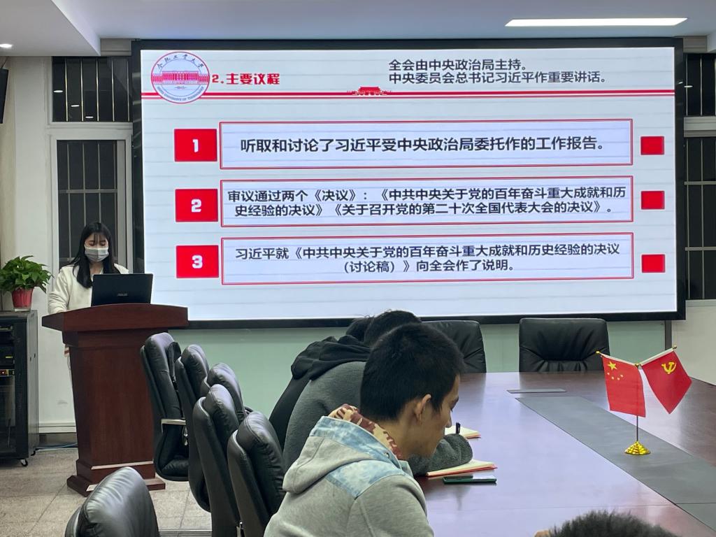 在学习中,大家首先回顾学习了十九届六中全会的主要议程、全会内容、会议意义并集中收看了建党百年宣传视频。学习中,同学们认真学习了全会的主要内容和所通过的关于《中共中央关于党的百年奋斗重大成就和历史经验的决议》,领会到一百年来中国共产党践行为中国人民谋幸福、为中华民族谋复兴的初心使命所进行的顽强奋斗、艰苦奋斗、不懈奋斗。