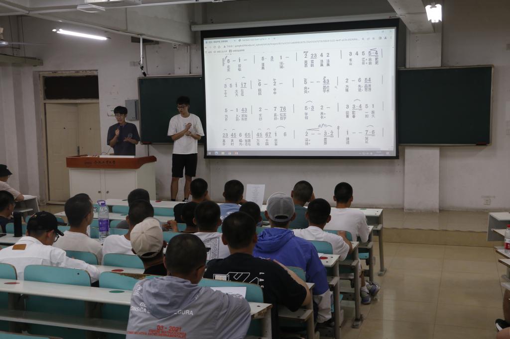 会上,辅导员老师从校歌的来历、内容以及所表达的精神与内涵三个方面出发,重点讲述了校歌的由来。破茧网络音乐文化工作室李俊辉、陆雨潇为同学们现场教授我校校歌《弦歌一路高声唱》。