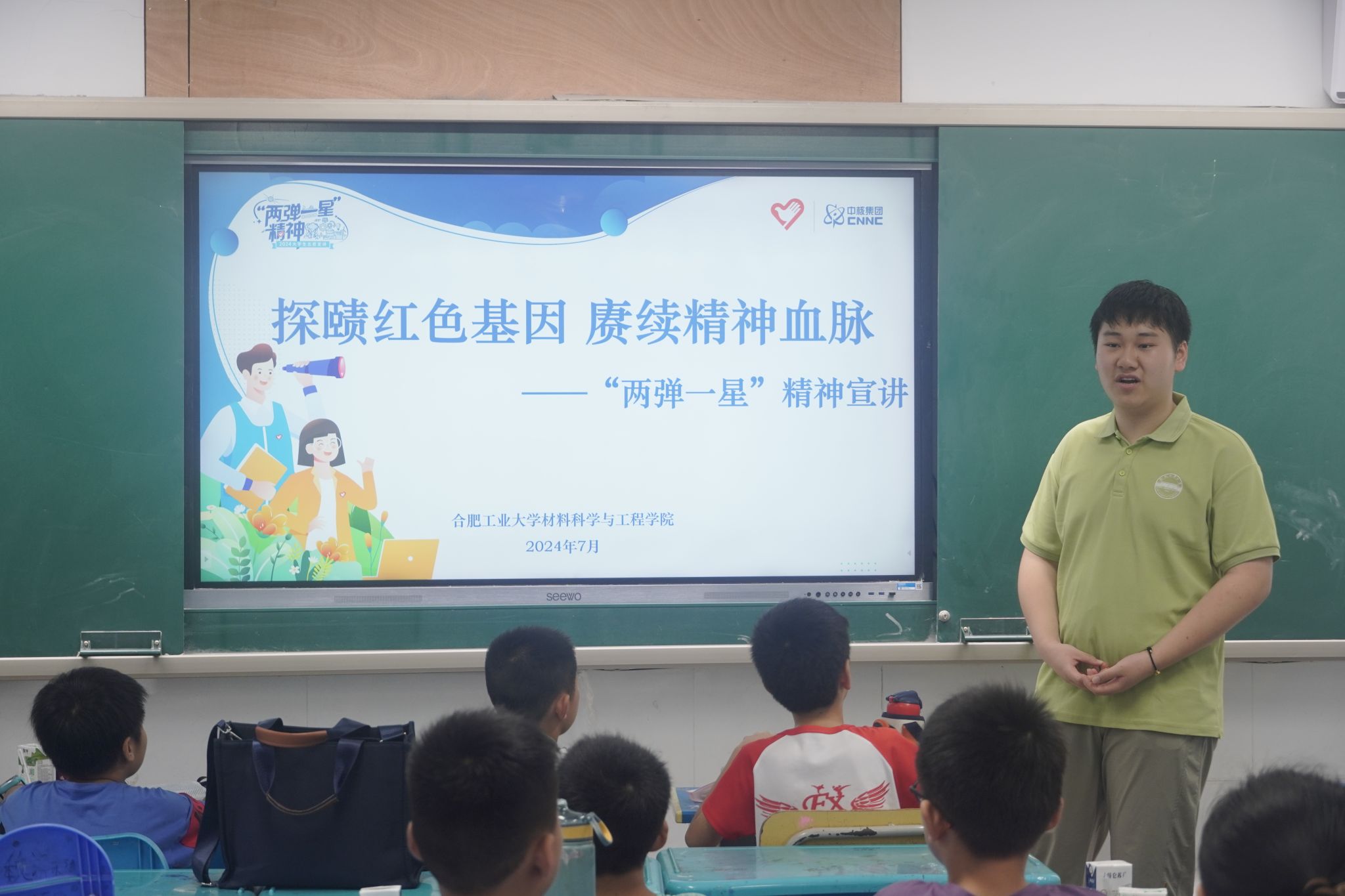 7月13日,开云官方官网登录入口“探赜两弹红色基因,赓续先辈精神血脉”“三下乡”暑期社会实践团队联合开云官方官网登录入口“青春飞扬,筑梦翱翔”大学生志愿支教团队,赴肥西县三河镇政府中心学校开展科普宣讲思政课。课程向学生们普及“两弹一星”精神内涵,引导学生们树立正确的价值观和人生观,厚植爱国情怀。