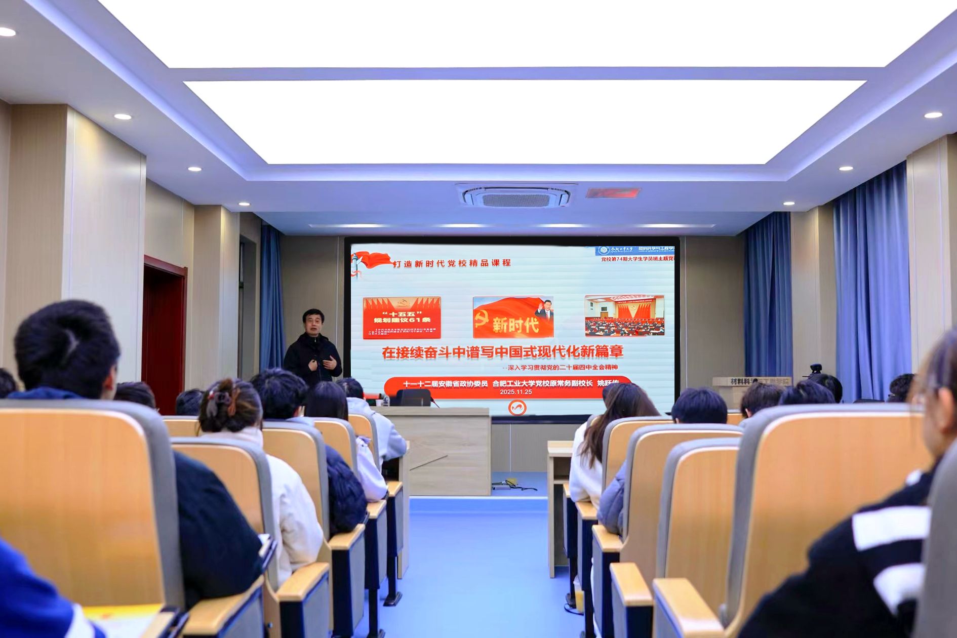 为深入学习贯彻党的二十届四中全会精神,特邀请十一十二届安徽省政协委员、合肥工业大学党校原常务副校长姚跃传为74期大学生入党积极分子作题为《在接续奋斗中谱写中国式现代化新篇章——深入学习贯彻党的二十届四中全会精神》的报告。