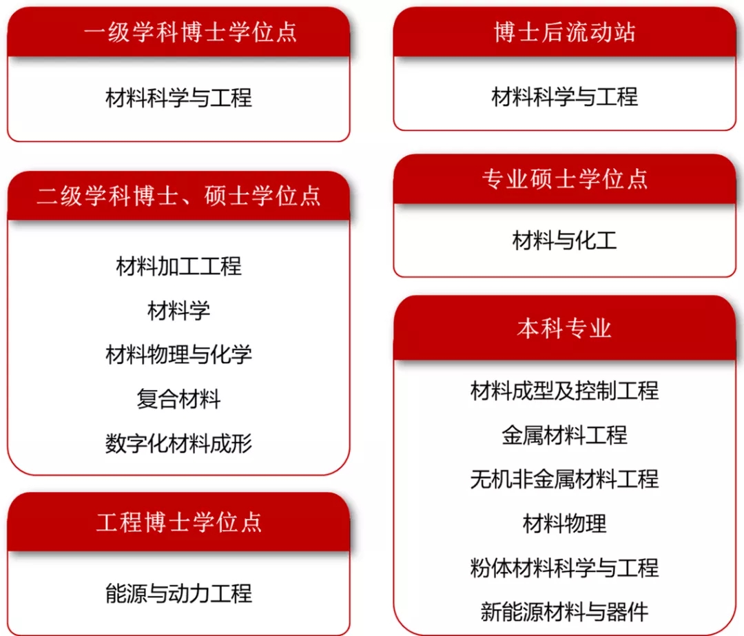 学院设有材料科学与工程一级学科博士学位点,一级学科博士后流动站,材料加工工程、材料学、材料物理与化学、复合材料、数字化材料成形5个二级学科博士学位(硕士学位)点,设有能源与动力工程博士学位点、材料与化工专业硕士学位点和6个本科专业。形成了“本科—硕士—博士—博士后”完整的高层次人才培养体系